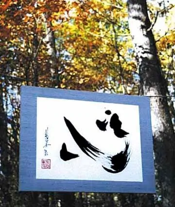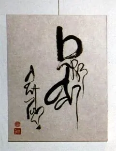 "Love" or Kokoro, meaning heart/mind/spirit love. Ink on washi, silk mounted on mizubari (wooden panel), 1996