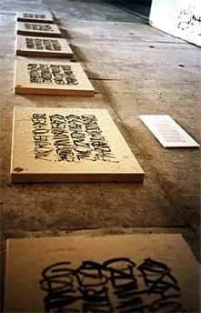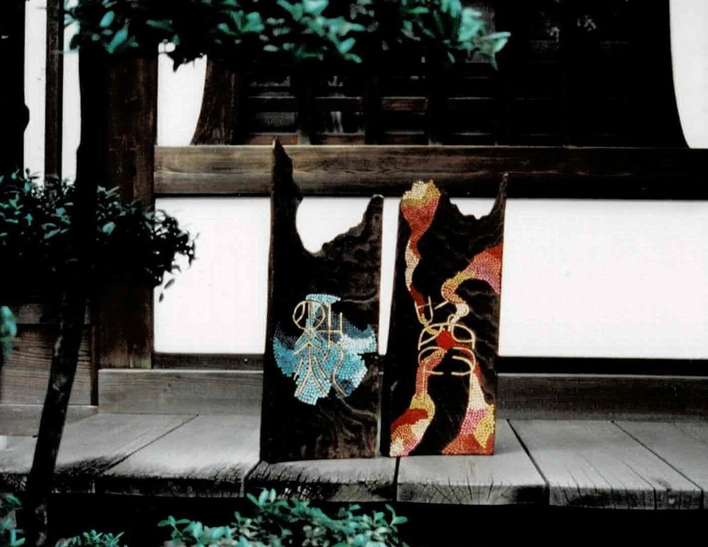 Salaryman Dreaming - Moku/Silence and Kan/Scream. Carving and dot paint on timber, reverse sides plastered with notes about voicelessness and the frustration of conformity. Homesick 1993