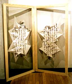 Folding Fly-screen. Ripped and patched like a traditional shoji paper screen. The quote is Australian advertising jingle "Louie the fly". Wood, washi, paper, ink & nylon mesh. Homesick, 1993