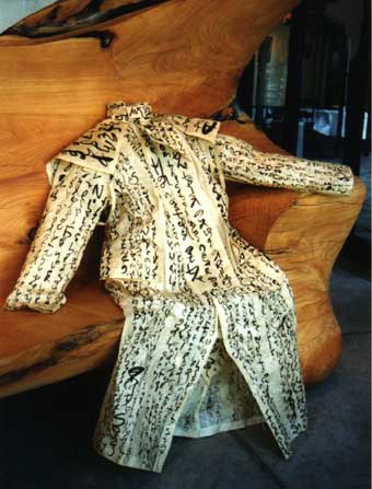 Drizapoem - "The man from Snowy River" > Banjo Patterson. Inscribed onto a real-size oiled rice-paper Drizabone(tm), Homesick 1993