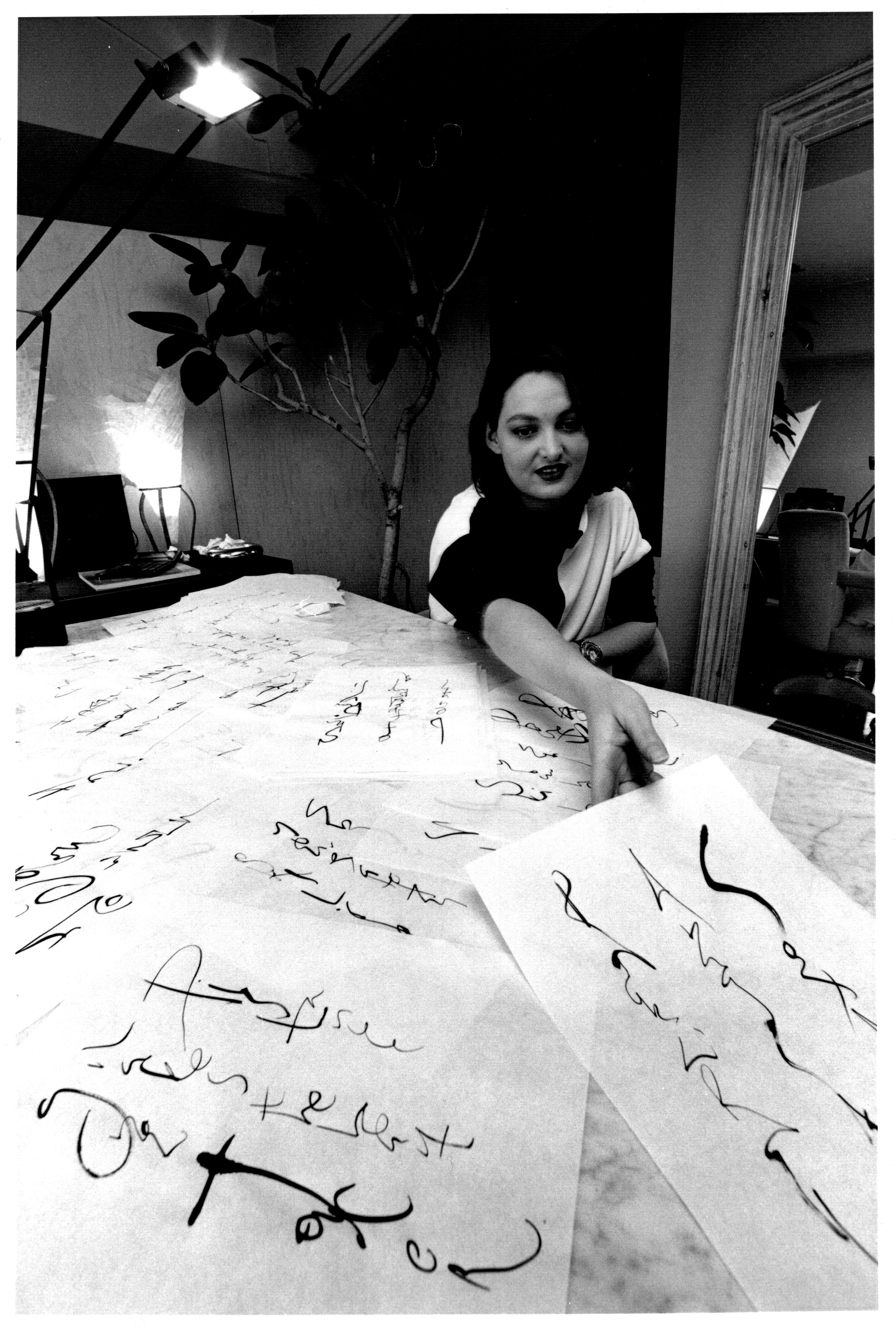 Walker encountered Japanese calligraphy while working at an interior design company handling Japanese scrolls, ”First I got interested in calligraphy because I couldn’t read it,” Walker said. ”Then I was fascinated to know that even Japanese can’t read it easily, so I was seeing Japanese calligraphy the same way as Japanese did.” Walker started to teach herself using Japanese calligraphy books. However, ”to make it more artistic and get more results quickly,” she invented her own Roman alphabet calligraphy, ”In the flow of India ink, I can express my natural feelings,” Walker explained, She was encouraged when a client of the company ordered two of her calligraphic works for his refurbished soba (Japanese noodle) house in Tokyo.