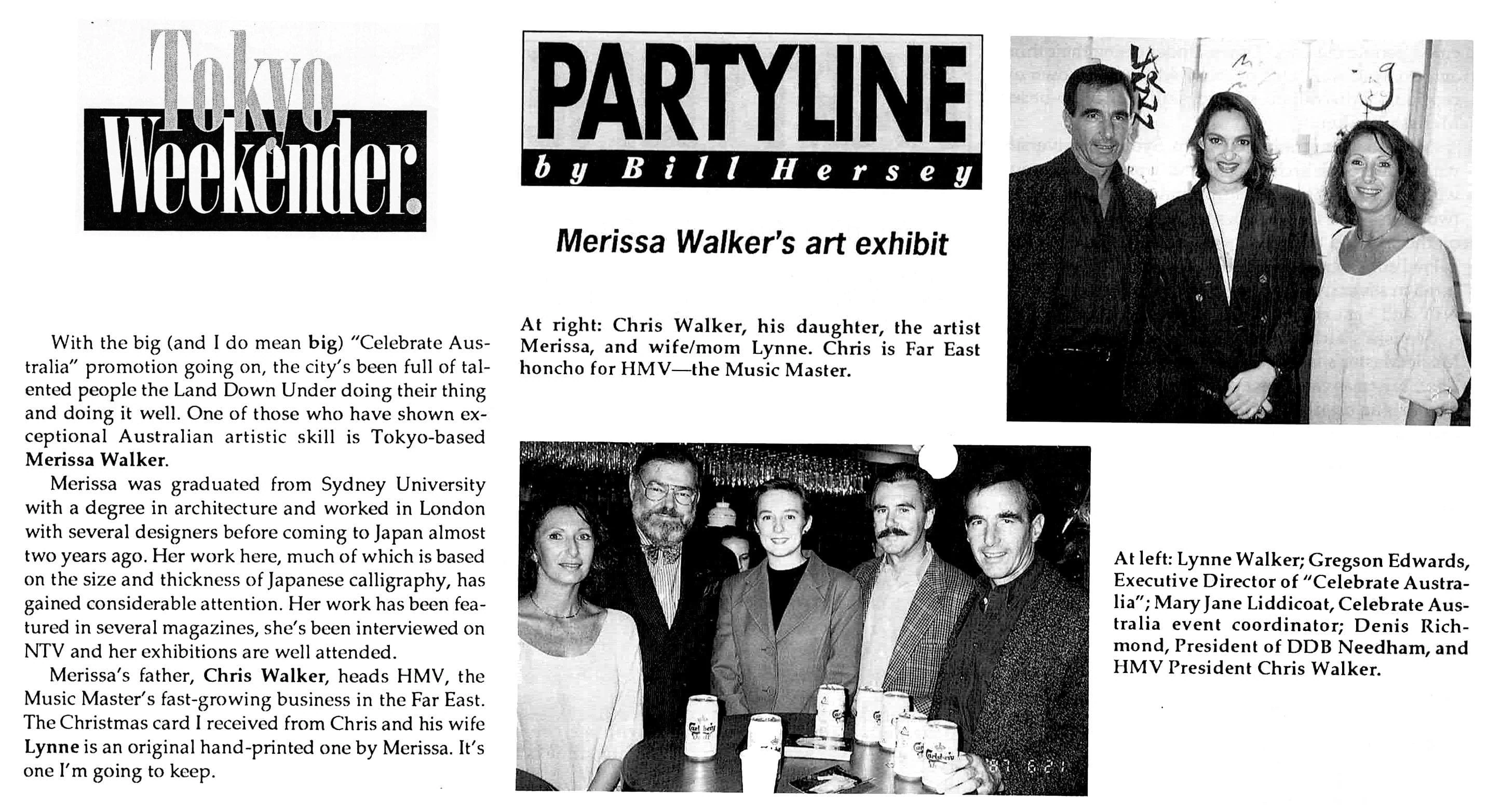 The Merissa Walker calligraphy exhibitions, official events of the 1993 Celebrate Australia Fair, are being held till Nov.26 at the German Cultural Centre (Goethe Institut) 7-5-58 Akasaka. Minato-ku Tokyo. Another exhibition starts Nov.23 at Wisma II Gallery, located at 3-7-4 Jingumae. Shibuya-ku. Tokyo.