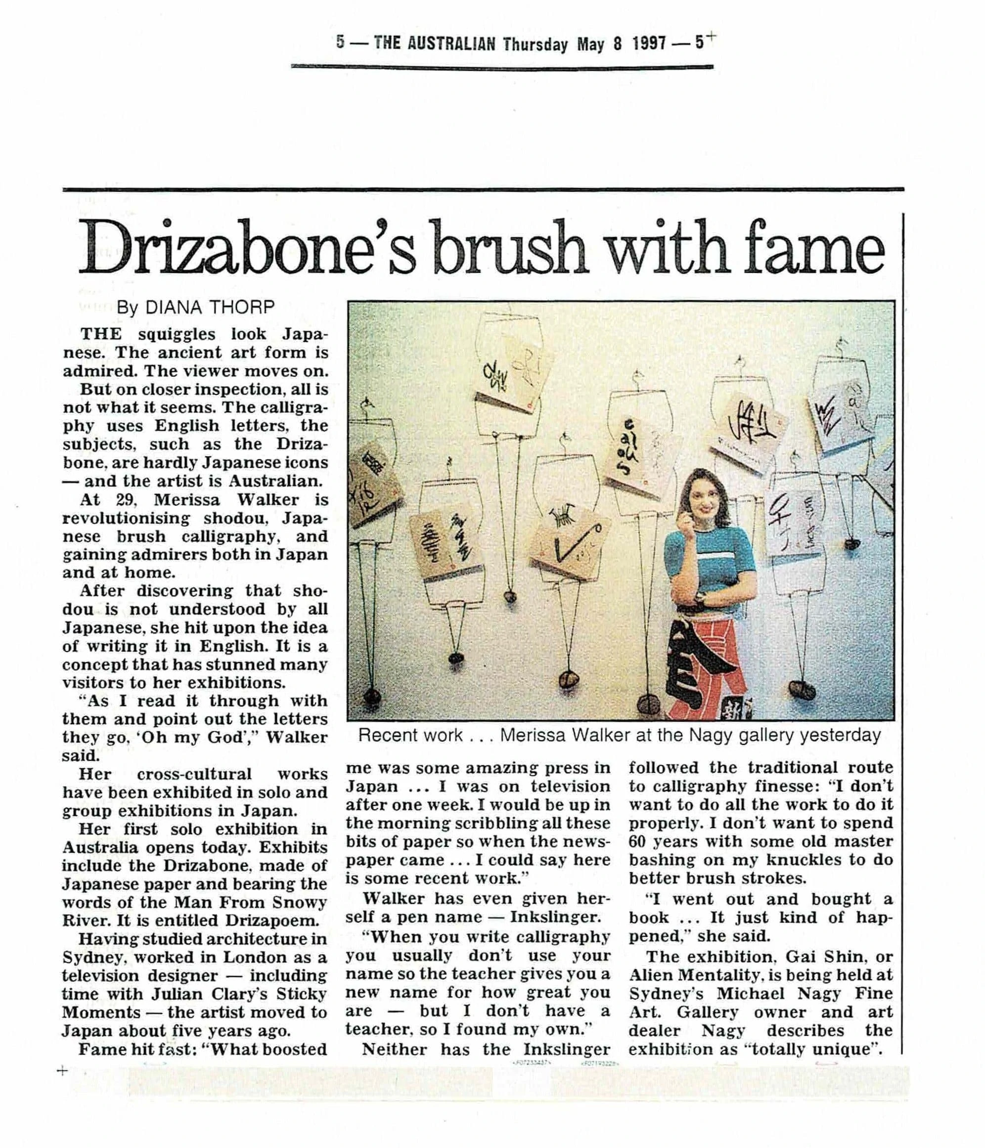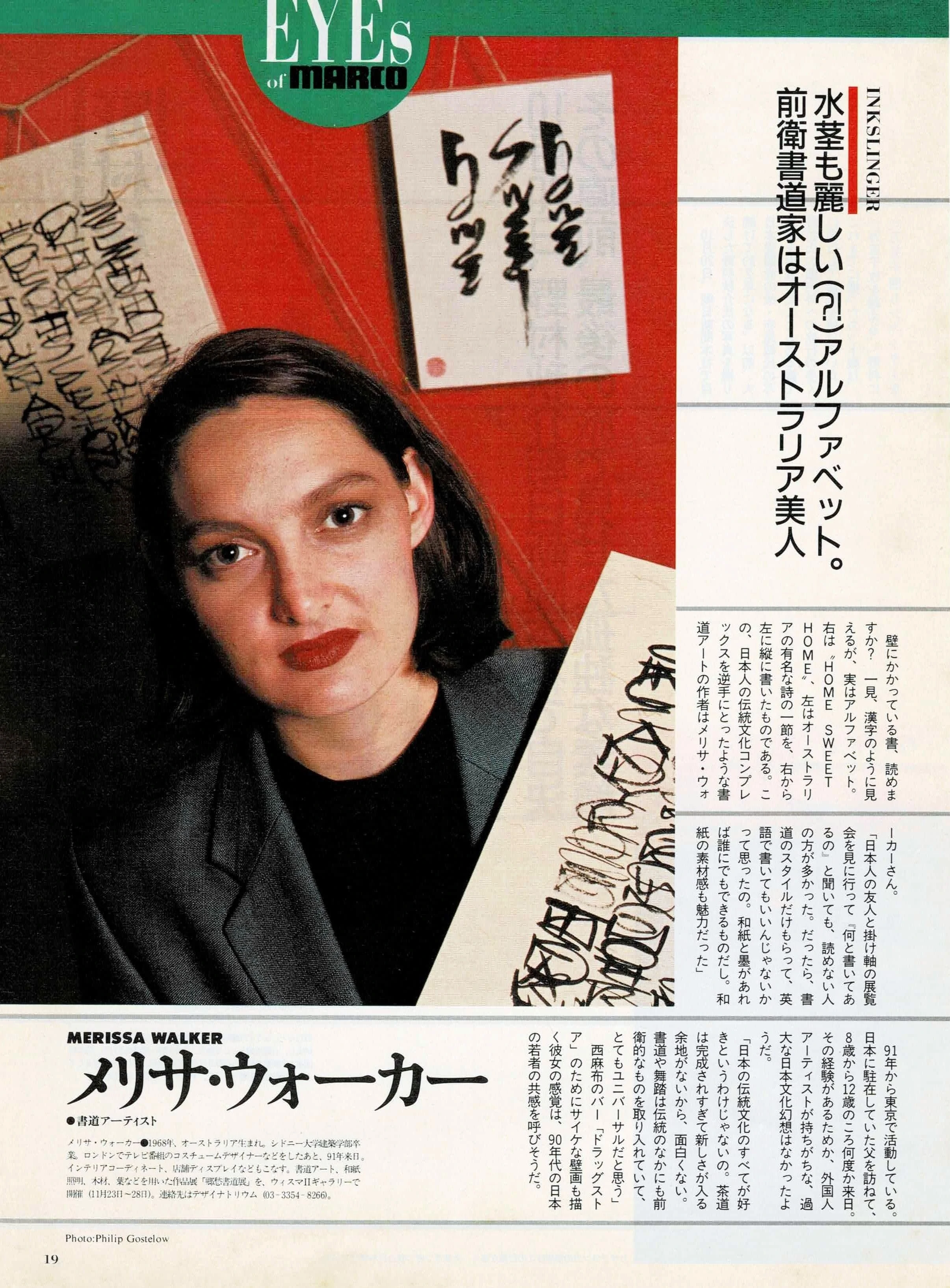 Merissa “Inkslinger” Walker is an Australian artist who has resided in Japan for four years. She trained as an architect and makes her living as a freelance designer of spaces, objects and events,that often utilizing her typographic style of art in the process. She began exploring Asian brush calligraphy (shodou) in 1992 and soon developed a unique style, basically the Roman alphabet written, with brush and ink, vertically and from right to left on the page, thus appearing to be abstracted Japanese text.